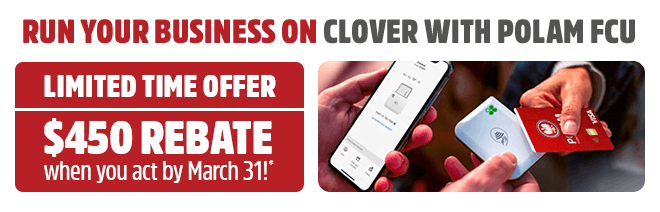 *Promotional offer valid from January 1, 2026, through March 31, 2026. This offer is available for qualified Polam FCU members who have not had a merchant services account processed by First Data Merchant Services LLC within six months. New accounts are subject to standard credit approval and underwriting requirements. Offer is valid for one $450 rebate for a Clover Flex, Flex Pocket, Mini, Station Solo or Duo point-of-sale hardware device purchase or lease. To be eligible for the rebate, the merchant must (1) be credit approved between 1/1/2026 and 3/31/26; (2) sign a merchant processing agreement; and (3) activate account within 30 days from approval date. The $450 rebate will be initiated approximately 60 days after the account begins processing transactions. Customer must process with First Data Merchant Services LLC for 90 days or forfeit the rebate. Early termination fees apply. Only one offer per eligible business tax ID. Eligibility is at the sole discretion of First Data Merchant Services LLC. Offer not valid with any other offer and subject to change without notice.© 2026 Clover Network, LLC. The Clover name and logo are registered trademarks owned by Clover Network, LLC and are registered or used in the U.S. and many foreign countries. Use of Clover requires a Merchant Processing Agreement. All trademarks, service marks and trade names referenced in this material are the property of their respective owners. 3657850 1/26